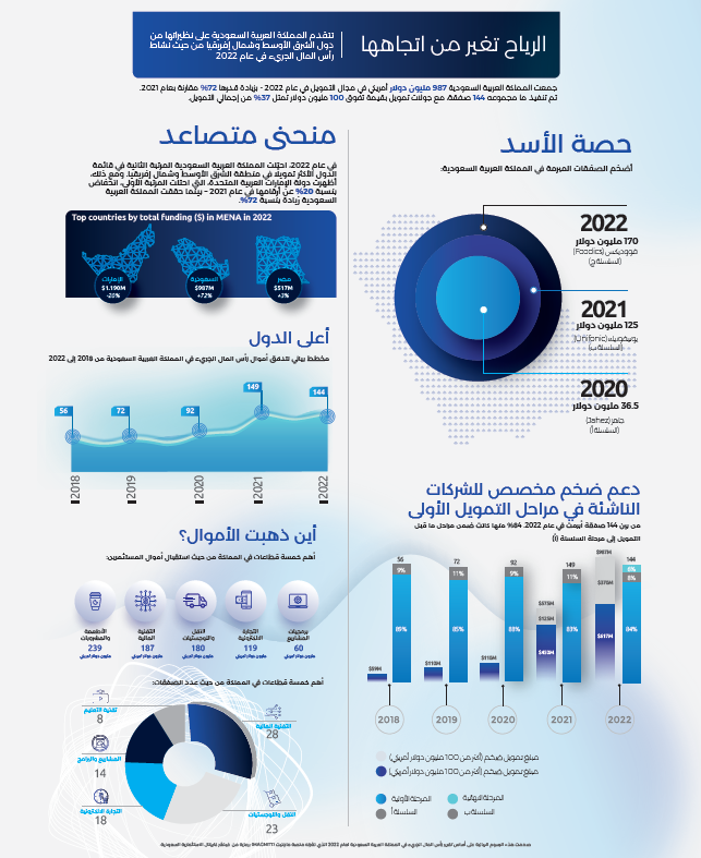 رسم بياني يعتمد على المعلومات المتاحة للجمهور عن تدفق رأس المال الاستثماري الذي شوهد في قطاع التكنولوجيا في المملكة العربية السعودية في عام 2022.